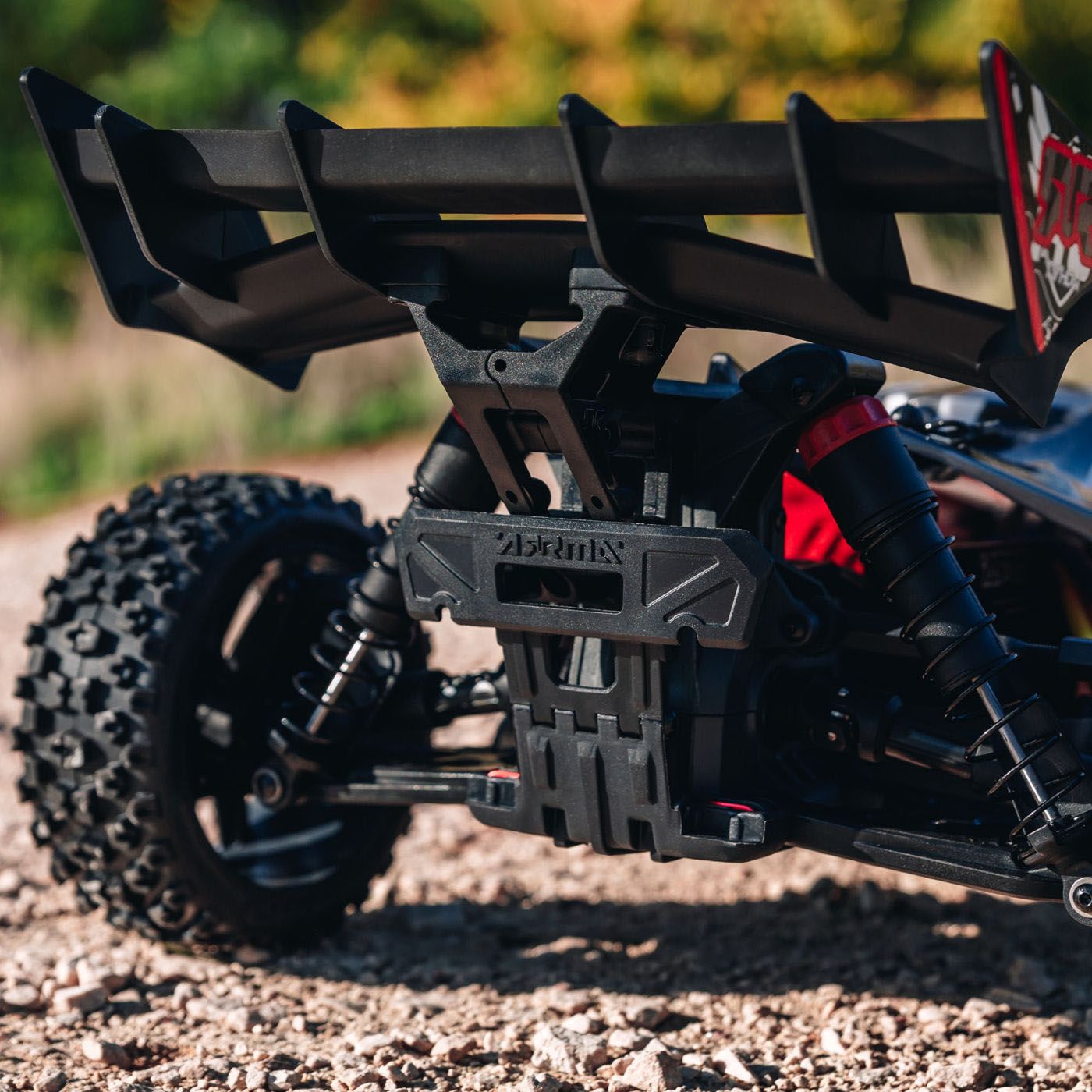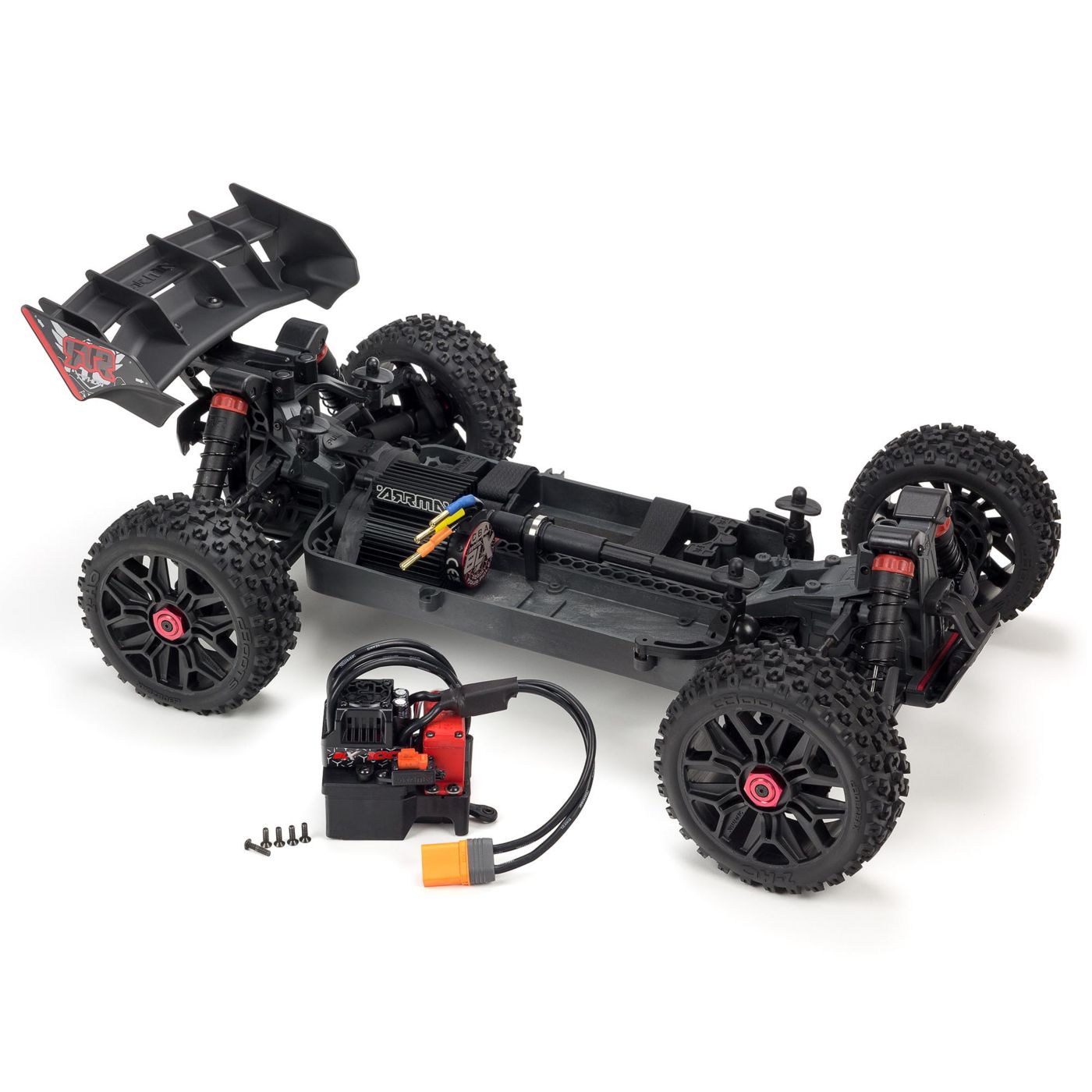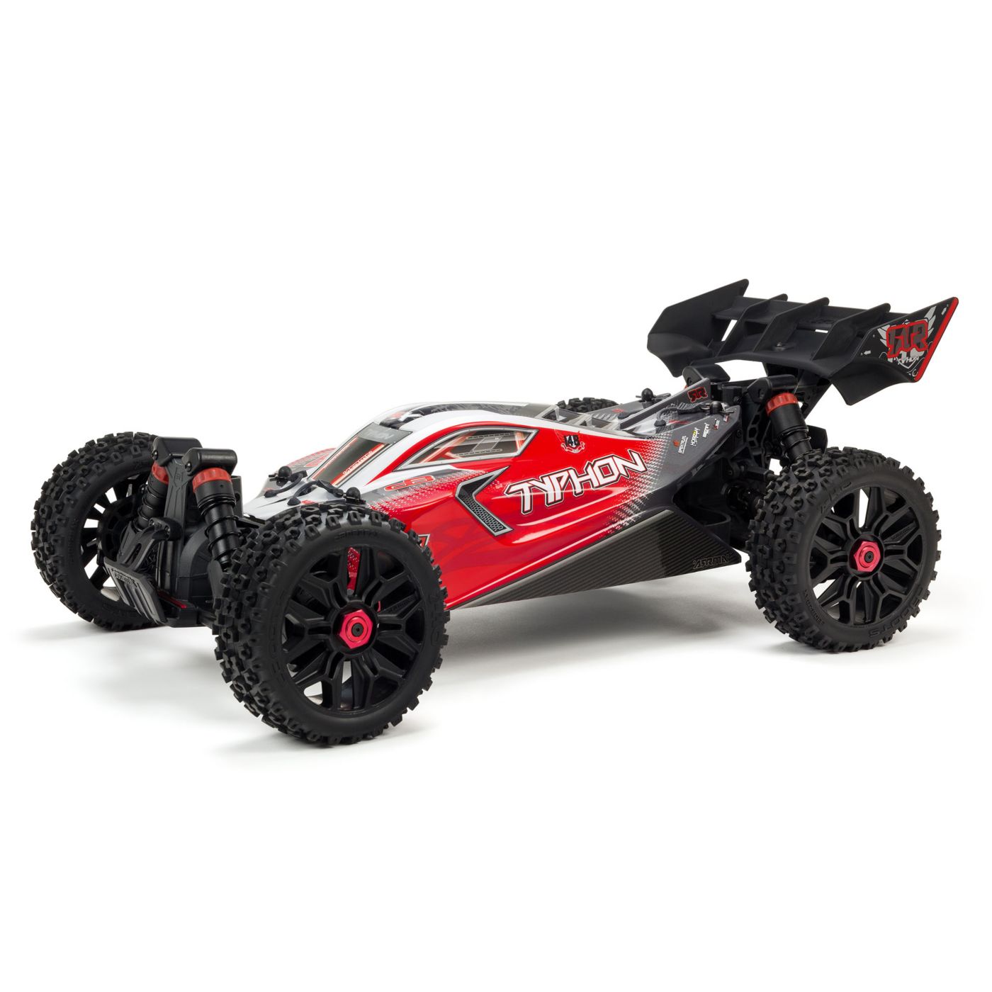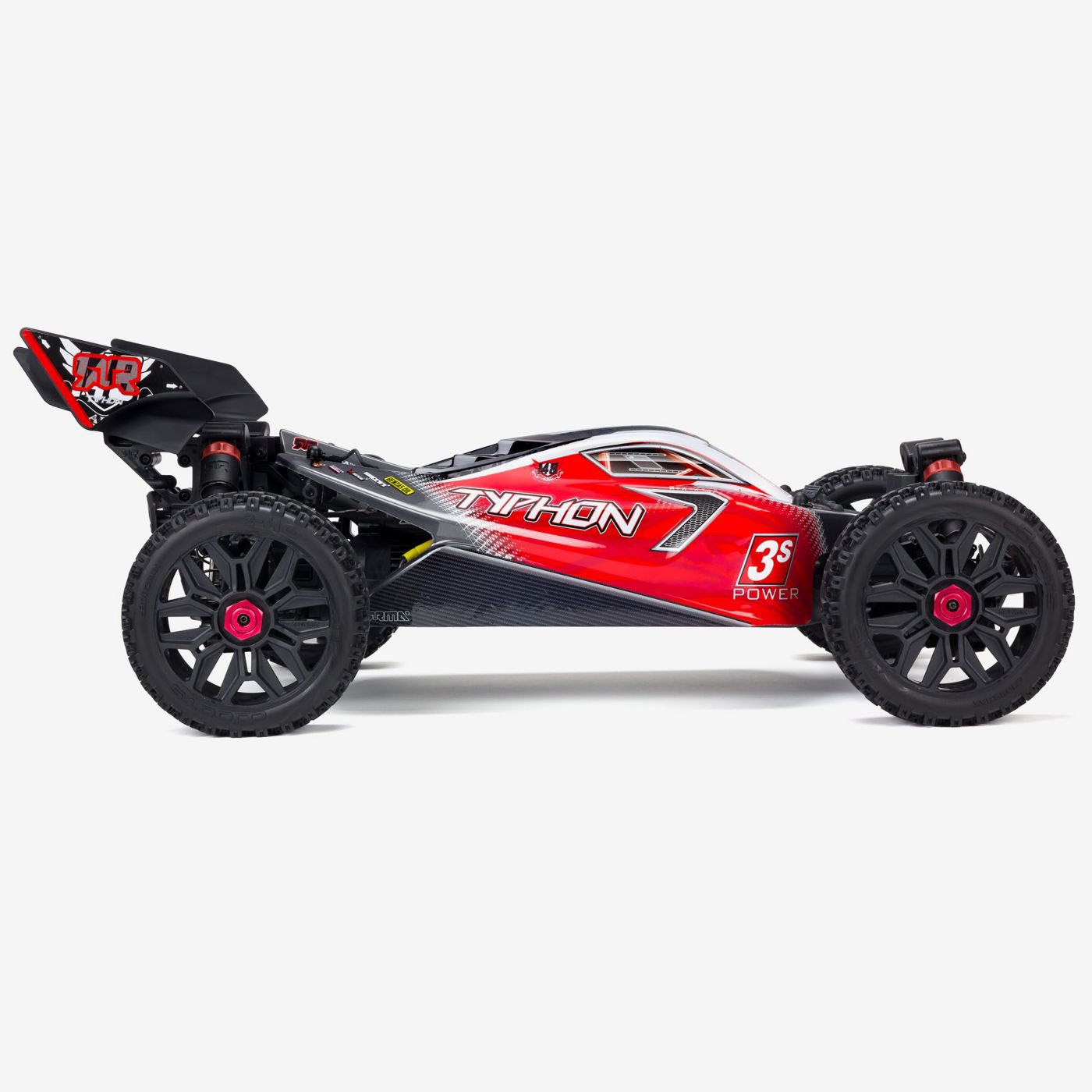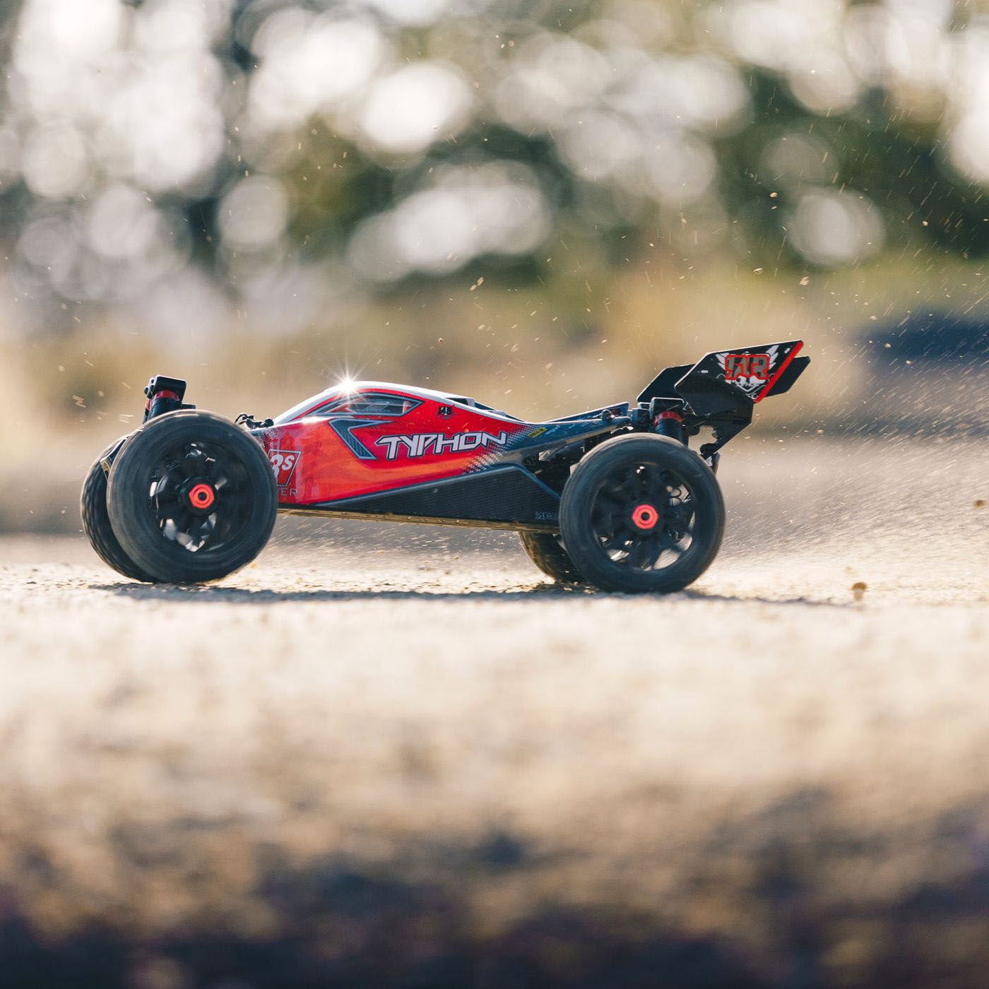 The low center of gravity, with wide arms and narrow buggy wheels and tires, improves handling over all of your favorite bashing terrain — race tracks, trails, muddy courses, skate parks, and more. With its metallic-finish body and forged composite detail, the TYPHON 4X4 3S BLX also looks as great as it performs. A stylish, high-downforce wing keeps all four wheels planted as you explore the upper limits of its outrageous speed range!