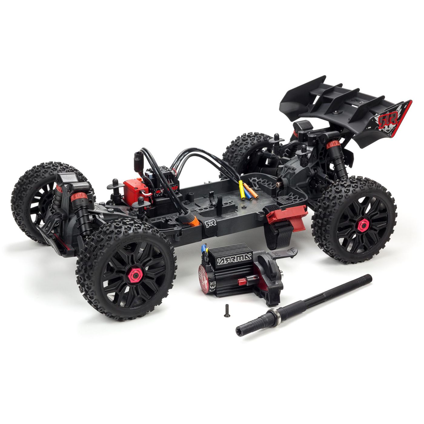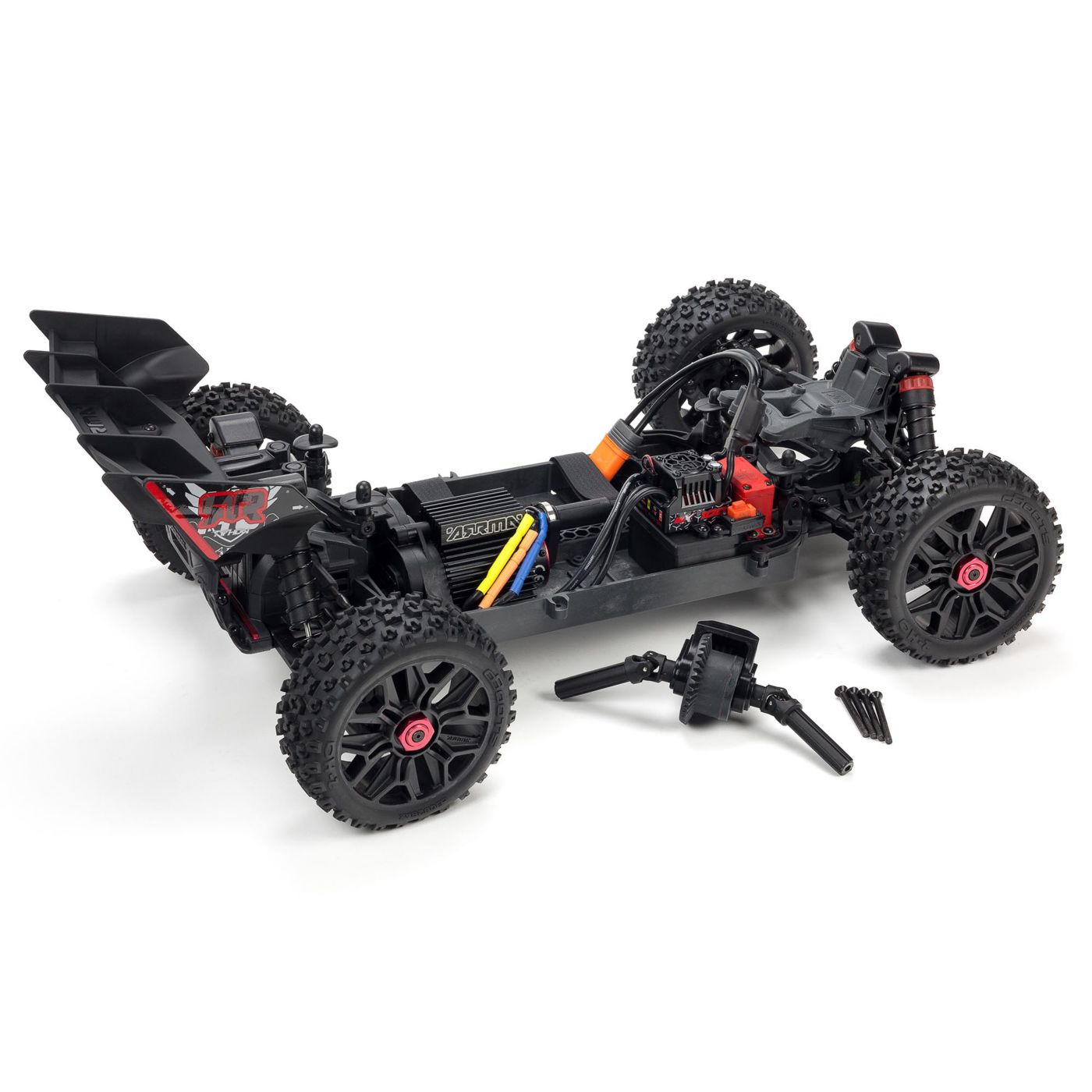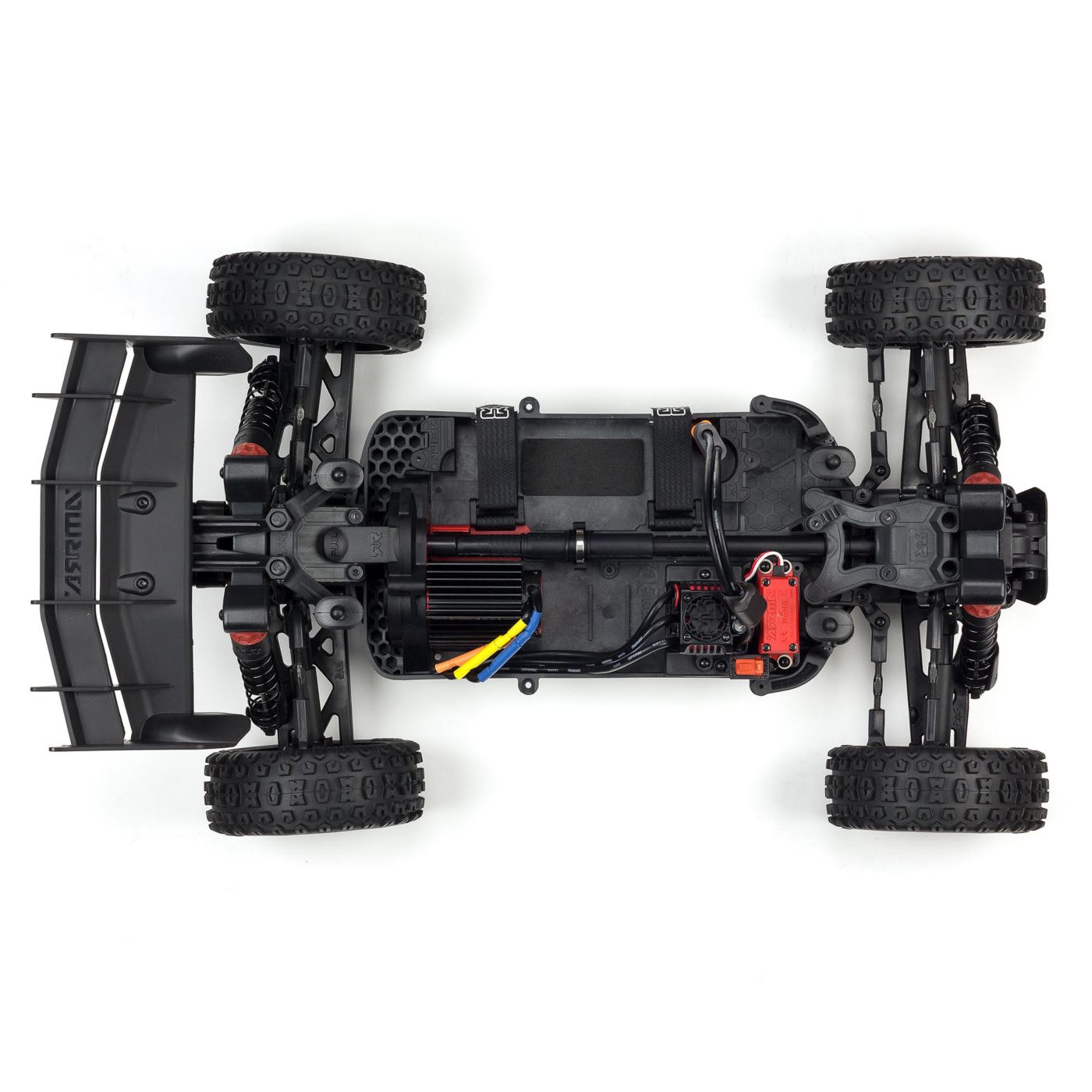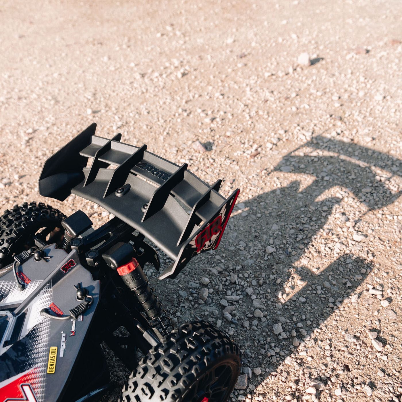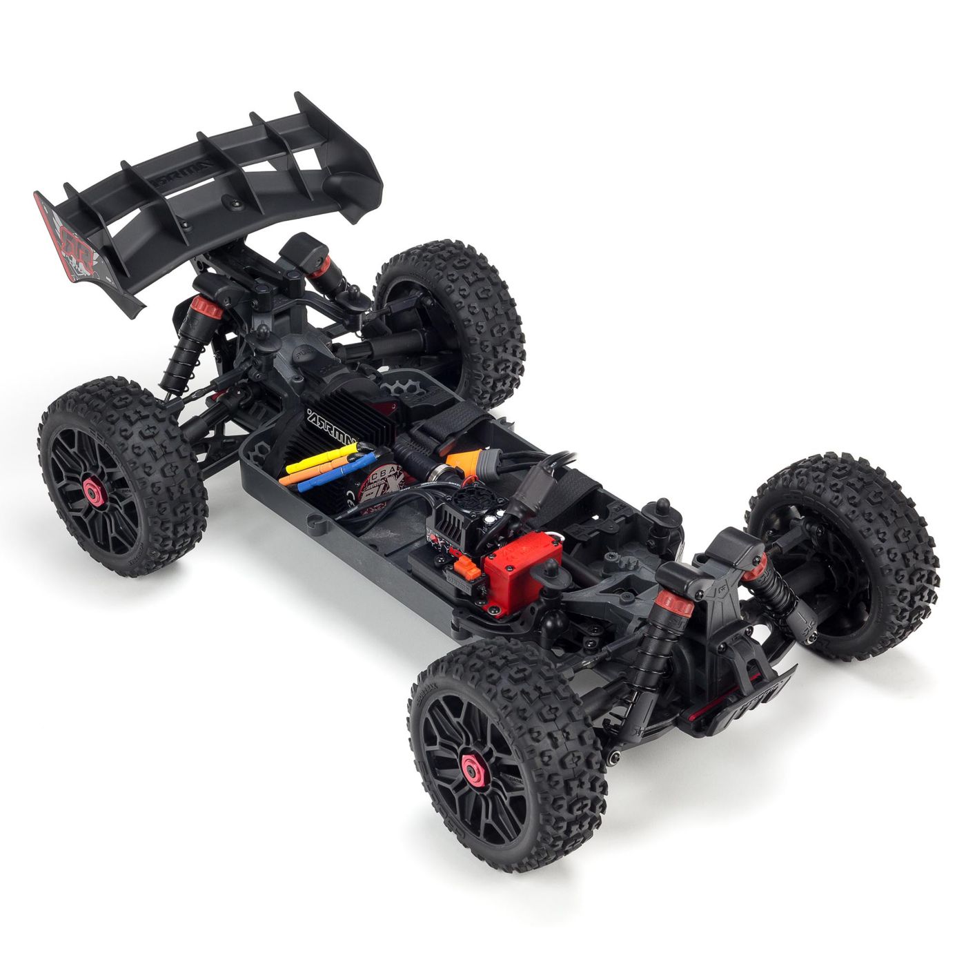 The low center of gravity, with wide arms and narrow buggy wheels and tires, improves handling over all of your favorite bashing terrain — race tracks, trails, muddy courses, skate parks, and more. With its metallic-finish body and forged composite detail, the TYPHON 4X4 3S BLX also looks as great as it performs. A stylish, high-downforce wing keeps all four wheels planted as you explore the upper limits of its outrageous speed range!