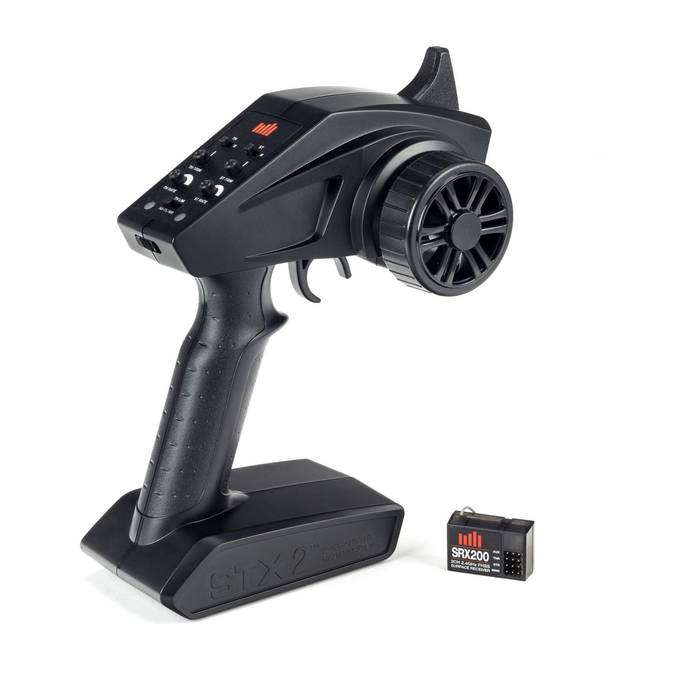 The new Spektrum STX2 2.4GHz 2-channel radio system provides many of the features found in high-end 2.4GHz radio systems, including throttle and steering reversing, throttle and steering travel adjust, and throttle limiting. The radio system also includes the Spektrum SRX200 2-channel waterproof receiver.